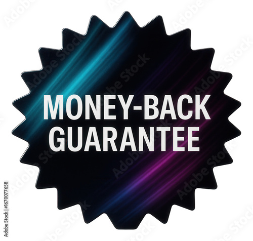 Fototapeta premium Glossy starburst sticker with MONEY-BACK GUARANTEE statement in bold lettering, compelling retail promo offer on transparent background.
