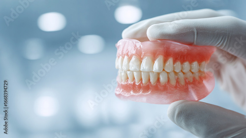 © Ninaveter, Fototapeta premium Gloved Hand Holding Dental Prosthetic Close-up.
