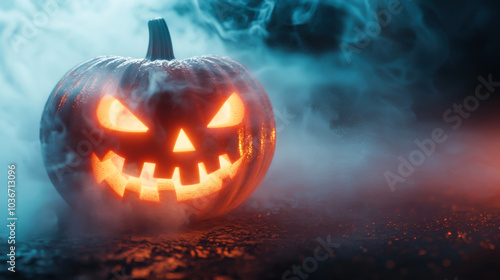 Naklejka premium Glow of a carved pumpkin on a misty Halloween night showcasing a sinister grin in eerie surroundings