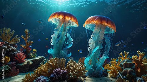 Naklejka premium glow vibrant jellyfish in the depths of the ocean