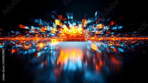 Naklejka premium Glowing, abstract cityscape reflected on a dark, glossy surface; vibrant orange and blue hues dominate, creating a sense of depth and movement
