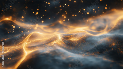 © Auxjiz, Naklejka premium Glowing abstract waves with shimmering particles in a dark background.