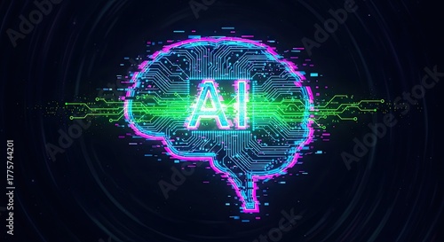 Obraz premium glowing AI circuit board icon formed from glitch lines and distortion, neon...