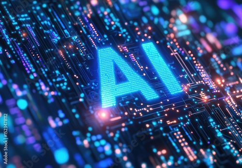 Obraz premium Glowing "AI" text over a futuristic circuit board with bright blue & orange...