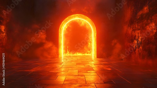 © Anusak, Fototapeta premium Glowing Archway in a Fiery Hellish Landscape - 3D Render.