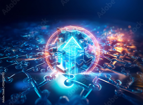 © joeycheung, Naklejka premium Glowing arrow ascends in a luminous circle, encircled by interconnected chains. Blue and orange lights enhance the scene, representing advancement.