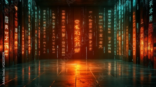 Obraz premium Glowing Asian script, futuristic room, data center, empty floor