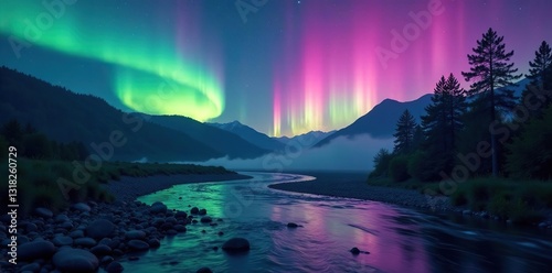 © Wasana, Naklejka premium Glowing aurora borealis above winding river banks, Landscape Photography, River