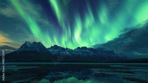 Naklejka premium Glowing aurora lights over a mountain range, capturing the beauty of the...