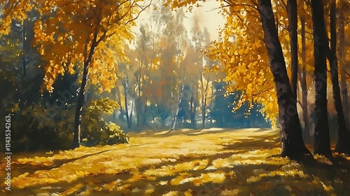 © heinng, Obraz premium Glowing autumnal trees landscape painting realistic art. AI Generated