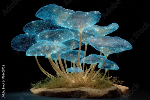 © Iryna, Naklejka premium Glowing bioluminescent mushrooms in dark setting