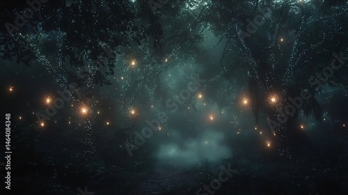 Naklejka premium Glowing bioluminescent trees a dark forest with floating lights and soft mist...