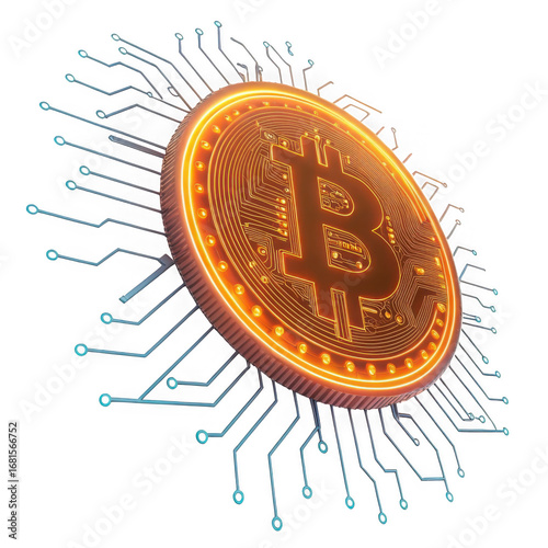 © PNG BOSS, Fototapeta premium Glowing bitcoin cryptocurrency coin connected to digital circuit board isolated on transparent background