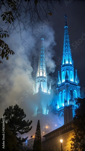 Fototapeta premium Glowing blue cathedral spires piercing through the night mist. Atmospheric...