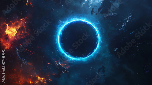 © Thiago, Naklejka premium Glowing blue circle illuminates dark space, solar eclipse with fiery energy ring. Magnetic Light Resonance. Illustration
