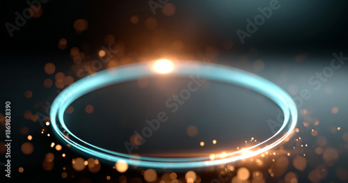 Obraz premium Glowing blue circular light ring with bright orange bokeh particles on dark...