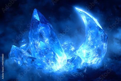 © Mang Ligan, Obraz premium Glowing blue crystal formations resembling a crescent moon.