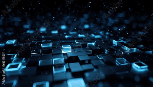 Obraz premium Glowing blue cubes form a digital landscape with depth and motion