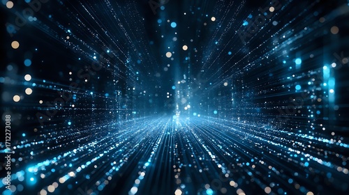 © Yuliia, Naklejka premium Glowing blue digital particles and light rays creating futuristic technology tunnel effect with bokeh and motion blur for technology backgrounds.
