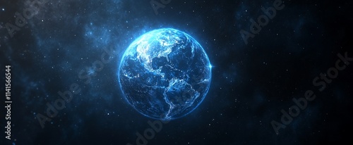 Fototapeta premium Glowing blue Earth in space, continents visible.