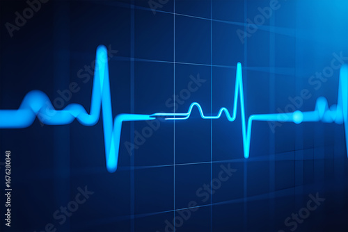 © rita, Naklejka premium Glowing blue electrocardiogram waveform on dark grid background heartbeat pulse
