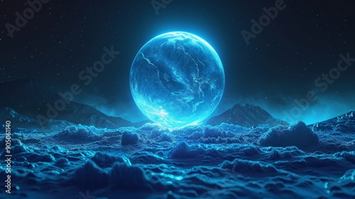 Fototapeta premium Glowing blue gradient sphere on black background, moon rise abstract grainy...
