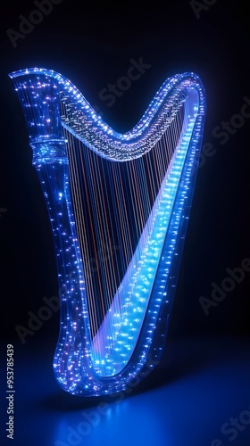 Obraz premium Glowing Blue Harp with Strings and Lights