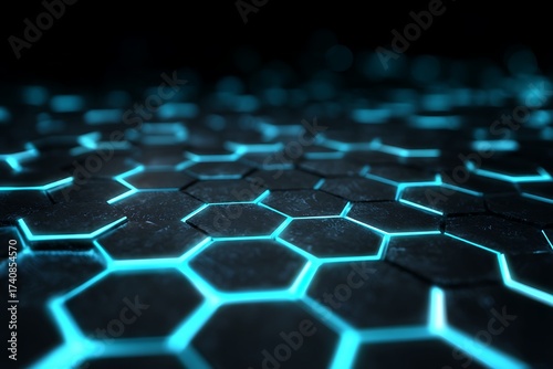 © TOHOMINA, Obraz premium Glowing blue hexagonal grid with dark background