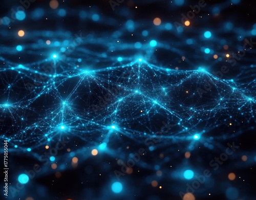 Fototapeta premium Glowing blue interconnected network nodes forming a complex web pattern on a dark background with scattered orange light particles