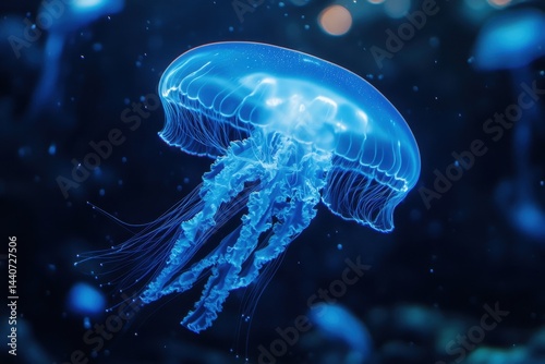 Fototapeta premium Glowing blue jellyfish drifting gracefully in deep underwater environment,...