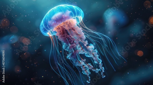 © Lubos Chlubny, Obraz premium Glowing blue jellyfish underwater emanates tranquil bioluminescent strands in the deep.
