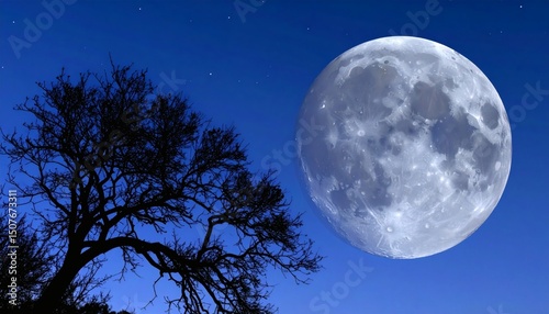 Naklejka premium Glowing blue moon behind dark tree high resolution photo