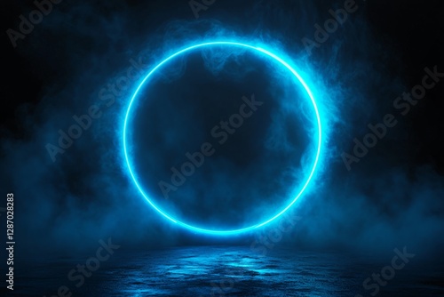 © Dmitry, Fototapeta premium Glowing blue neon circle ring reflected in dark water at night. Mystical portal effect with fog and smoke. Abstract futuristic geometric shape for sci fi design concept