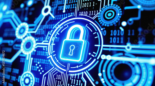 Obraz premium Glowing blue padlock surrounded by binary code, digital circuits, and...