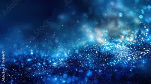 © Newleks, Obraz premium Glowing blue particles swirling in dynamic wave pattern, generating magical luminescent backdrop with soft bokeh lighting, representing ethereal digital fantasy landscape