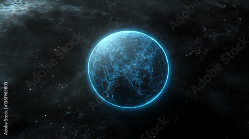 Obraz premium Glowing blue planet in dark space.