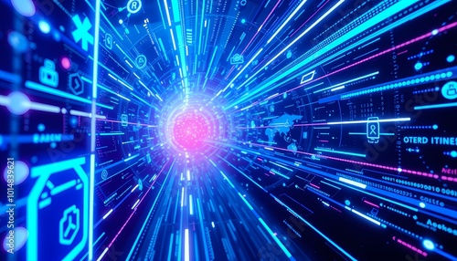 Fototapeta premium Glowing Blue Symbols and Data Streams in a Virtual World