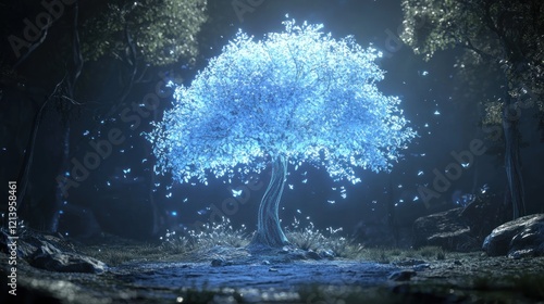 Fototapeta premium Glowing Blue Tree Surrounded By Butterflies In Forest