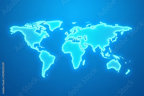 © NisatFarjana, Obraz premium Glowing blue world map outline on a gradient blue background showing continents and oceans in a simplified style