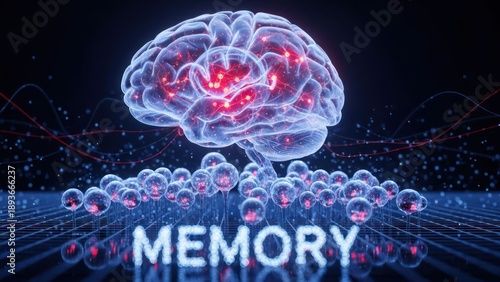 © AFFANYUDA, Fototapeta premium Glowing brain with memory spheres on reflective surface