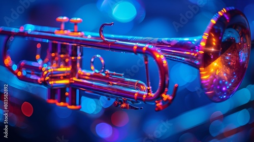 Fototapeta premium Glowing Brass Trumpet with Reflective Orange Highlights Under Vibrant Blue Stage Lights and Bokeh