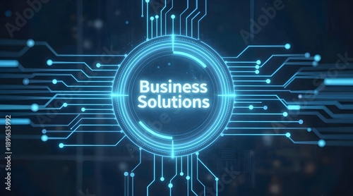 Fototapeta premium Glowing business solutions text inside a digital circuit with a dark background