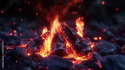 © DigitalDruid, Naklejka premium Glowing campfire with burning logs and vibrant flames in a dark outdoor setting showcasing warmth and wilderness atmosphere