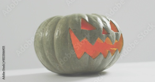 Fototapeta premium Glowing carved green-gray pumpkin casting warm orange light on white...