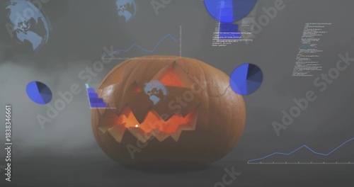 © vectorfusionart, Obraz premium Glowing carved jack-o'-lantern emitting amber light on studio surface, with fog and holograms