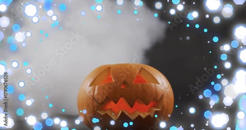 © vectorfusionart, Naklejka premium Glowing carved pumpkin jack-o'-lantern casting warm studio light, with fog and hexagonal blue bokeh