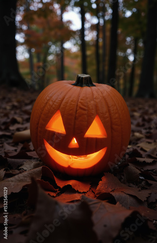 © NS Frames, Obraz premium Glowing carved pumpkin on forest floor with autumn leaves.