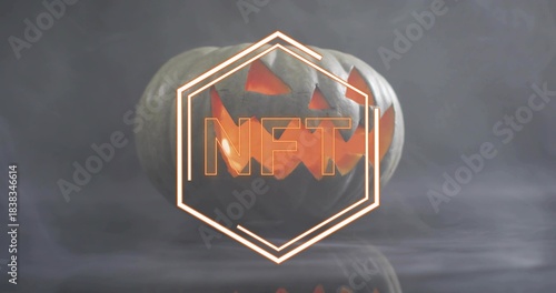 Obraz premium Glowing carved pumpkin sitting on reflective studio table, with neon hexagon and NFT letters in fog