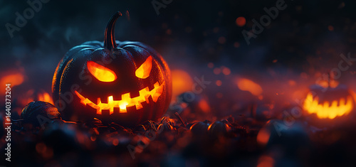 Fototapeta premium Glowing carved pumpkins creating spooky Halloween night atmosphere