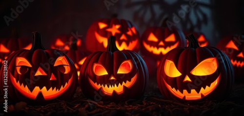 Fototapeta premium Glowing carved pumpkins with sinister grins, demonic eyes, and wicked smiles...